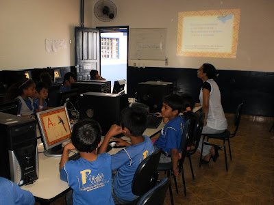 (espanhol). Trabalhando com Leitura de Cuentos Cortos, com auxílio dos computadores. Os alunos do 5 ano realizaram pesquisas de vários cuentos em espanhol, em seguida fizeram leitura no microfone. Com objetivo Ler e